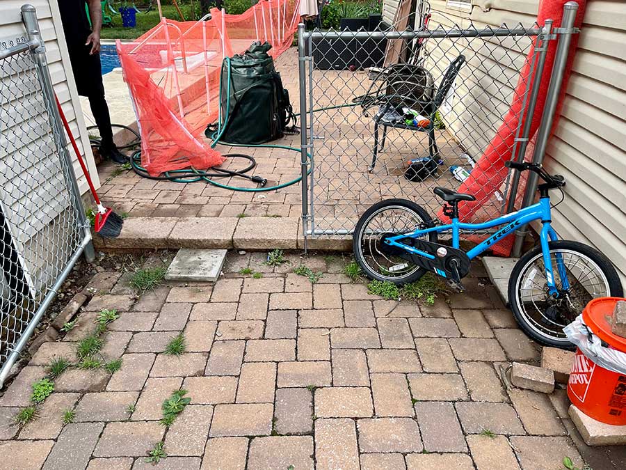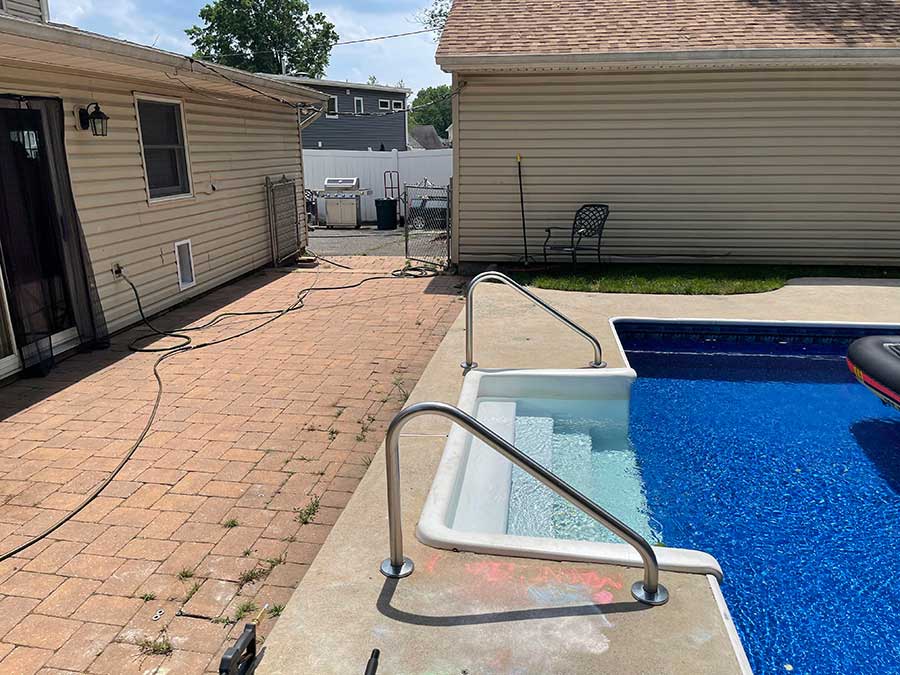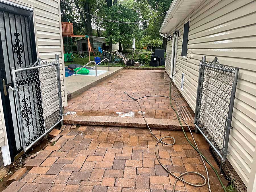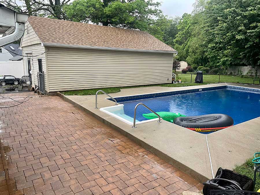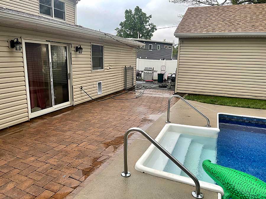To start, there were many different surfaces and methods used to touch up a property in Edison, NJ. We came out to find algae growing on the home siding, dirty pavers with weeds growing through, a stained pool area & portions of the fence that needed a refresh. We treated the moss and algae on the siding by soft washing it with a thorough rinse. We were able to surface clean the entire poolside area, and we post-treated. After pre-treating and surface cleaning the pavers, I hand-picked the remaining dead weeds to get us from 94% to 100%. We aim to cover every base on every job. Final rinse & the day is done.